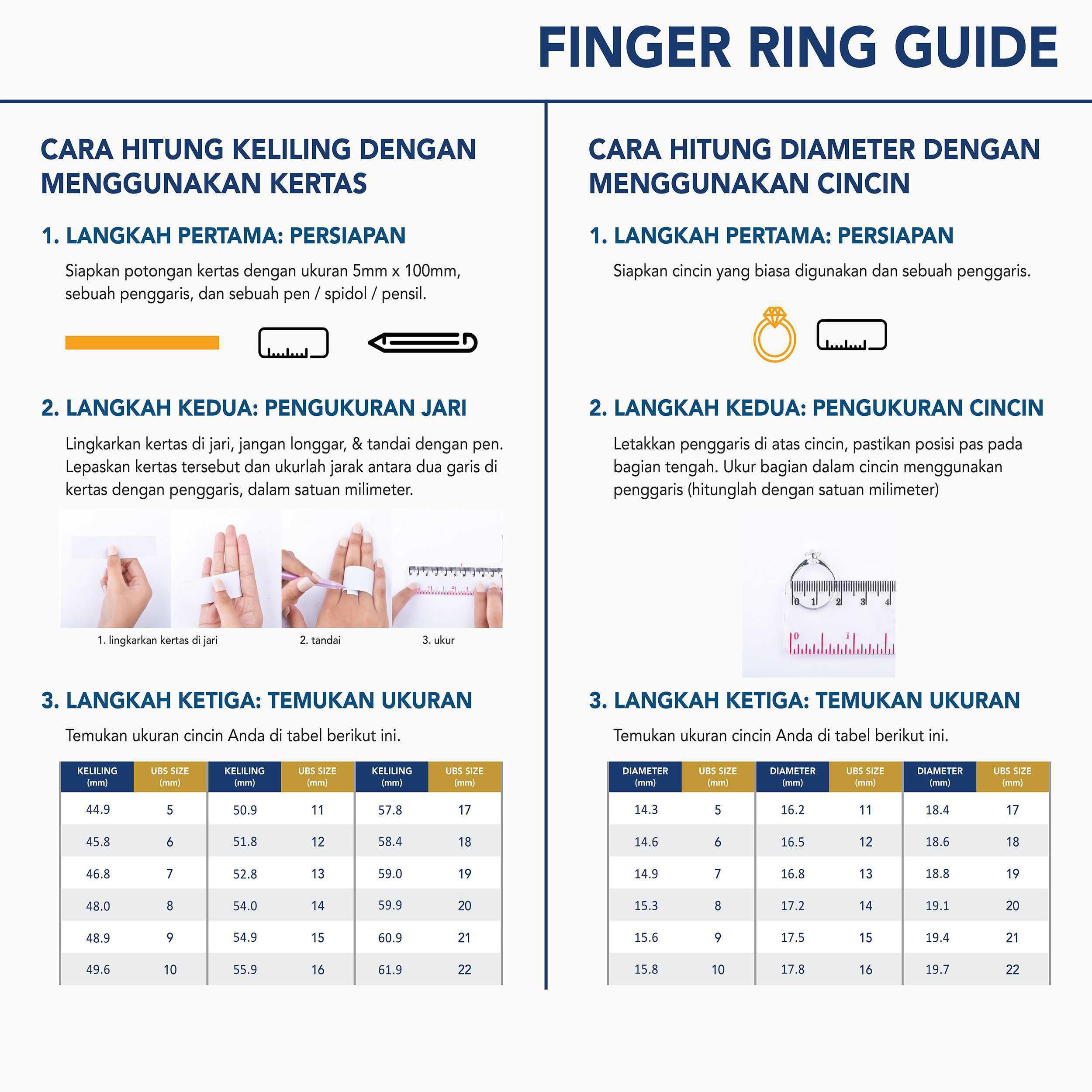 Bila anda membeli cincin baik untuk anda sendiri atau orang lain, kami menyadari bahwa mungkin anda tidak mengetahui ukuran cincin yang pas di jari anda. Metode yang kami sebutkan dibawah ini adalah pendekatan yang mudah bila mana anda tidak menggunakan “Ring Sizer” yang terdapat di toko perhiasan. Cincin anda harus pas di jari dengan nyaman, tidak terlalu longgar sehingga bisa lepas dengan mudah, atau sempit sehingga tidak nyaman dipakai berlama – lama. Harus diingat bahwa metode dibawah ini adalah pendekatan semata. Silahkan gunakan panduan dibawah ini. DOWNLOAD RING SIZE GUIDE
